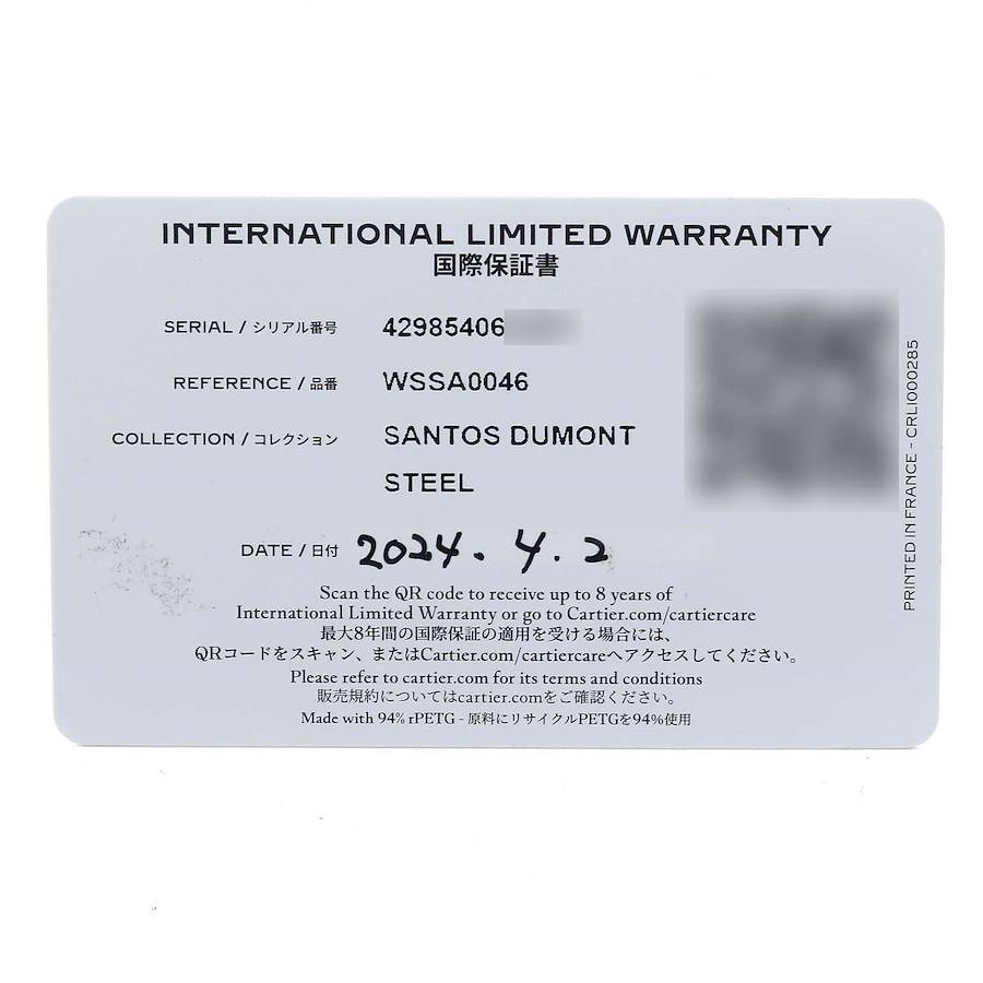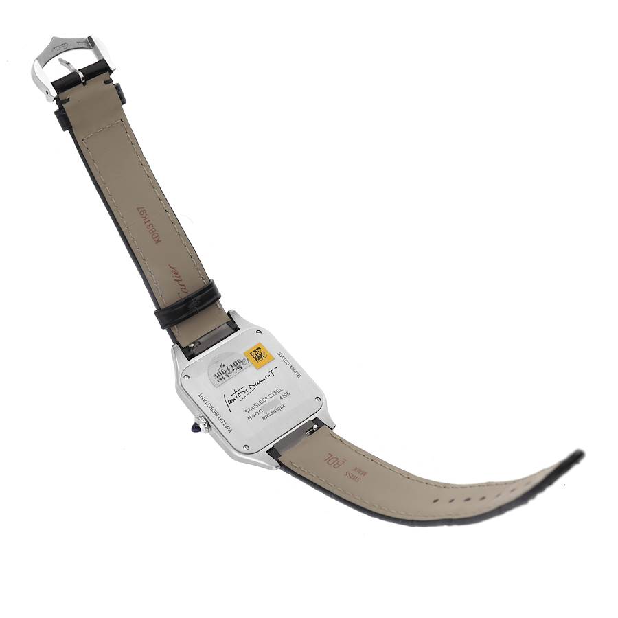 Cartier Santos Dumont Large Black Strap Steel Mens Watch WSSA0046 Unworn. Manual winding movement. Stainless steel case with black lacquer 43.5 mm x 31.4 mm. Case back engraved with handwritten signature of Alberto Santos-Dumont. Circular grained crown set with a blue spinel cabochon. Stainless steel bezel with black lacquer punctuated with 8 signature screws. Scratch resistant sapphire crystal. Black square decoration dial with translucent lacquer. Raised Roman numeral hour markers and sword-shaped hands. Black leather strap with a stainless steel ardillon buckle.
