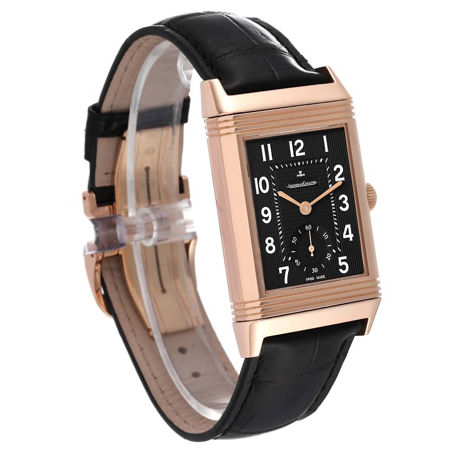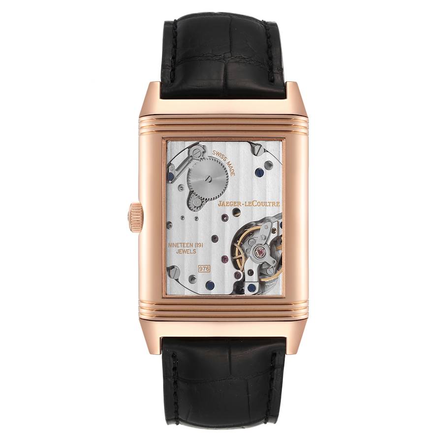 Jaeger LeCoultre Grande Reverso 976 Rose Gold Watch 273.2.04 Q3732470. Manual winding movement. 18K rose gold rectangular rotating case 48.5 x 30.0 mm. Case flips over to reveal a transparent exhibition sapphire crystal case back displaying the movement with linear Cotes de Geneve finish. 18K rose gold ribbed bezel. Scratch resistant sapphire crystal. Black engine-turned dial with arabic numerals. Rose gold epee hands. Sunken subsidiary seconds dial at 6 o’clock. Black alligator strap with 18K rose gold deployant clasp.