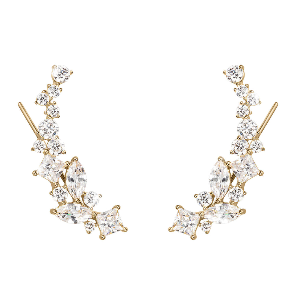 Stand out earrings with a sophisticated, sparkling look. Finely crafted from sterling silver, luxuriously finished in yellow gold. Featuring shimmering DS created Diamondeau®, flawless simulated diamond in princess, brilliant round and marquise cuts which will make a striking addition to your jewelry collection.